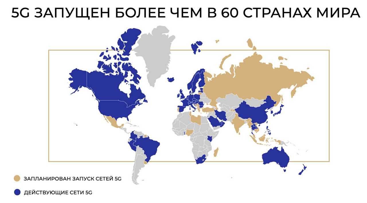 «Впереди планеты всей» по внедрению сетей 5G сегодня идет Южная Корея. Пятое поколение было протестировано на Олимпиаде в Пхенчхане зимой 2018 года. А с 5 апреля 2019 года в Южной Корее компания Samsung запустила продажи первого смартфона, совместимого с 5G. По существующим данным 10-миллионный Сеул и еще 85 городов страны уже готовы к скоростям нового поколения. Работы по запуску 5G-сетей активно ведутся в США, Японии, Швейцарии. Китай планирует покрыть страну скоростным мобильным интернетом уже к 2020 году.