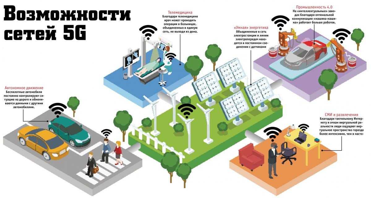 Такие возможности появляются у сети 5G благодаря увеличению радиочастот с единиц до десятков ГГц, то есть увеличению пропускной способности канала, и использованию многоканальности. Все это в совокупности должно дать импульс развитию «интернета вещей», когда различные устройства смогут непрерывно обмениваться данными без участия человека.